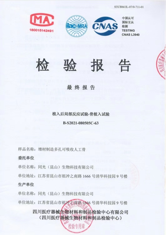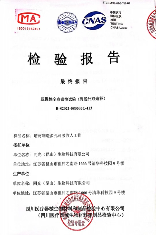 同光生物3D打印可吸收骨科植入物产品继2021年8月取得8项生物相容性检验报告后,2022年12月获得了四川医疗器械生物材料和制品检验中心出具的“亚慢性全身毒性试验”和“骨植入试验”检验报告,至此,产品已顺利通过全部10项生物相容性检测,充分证明产品具有良好的生物安全性。